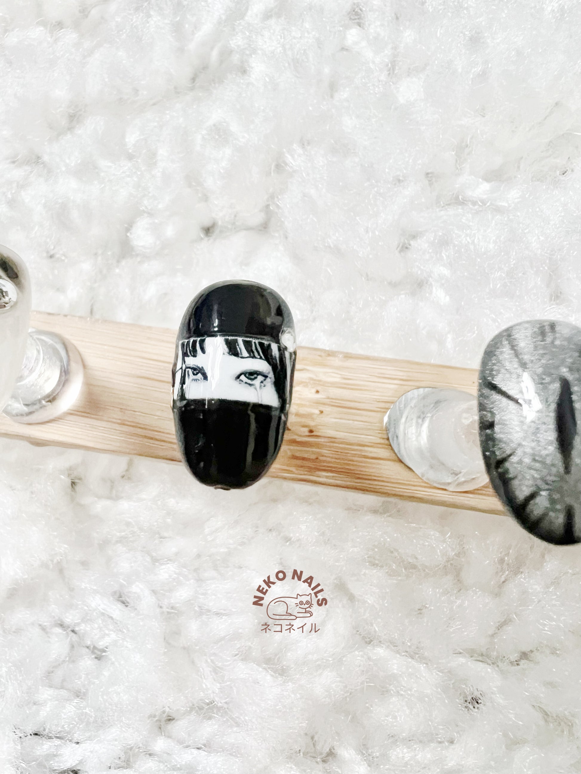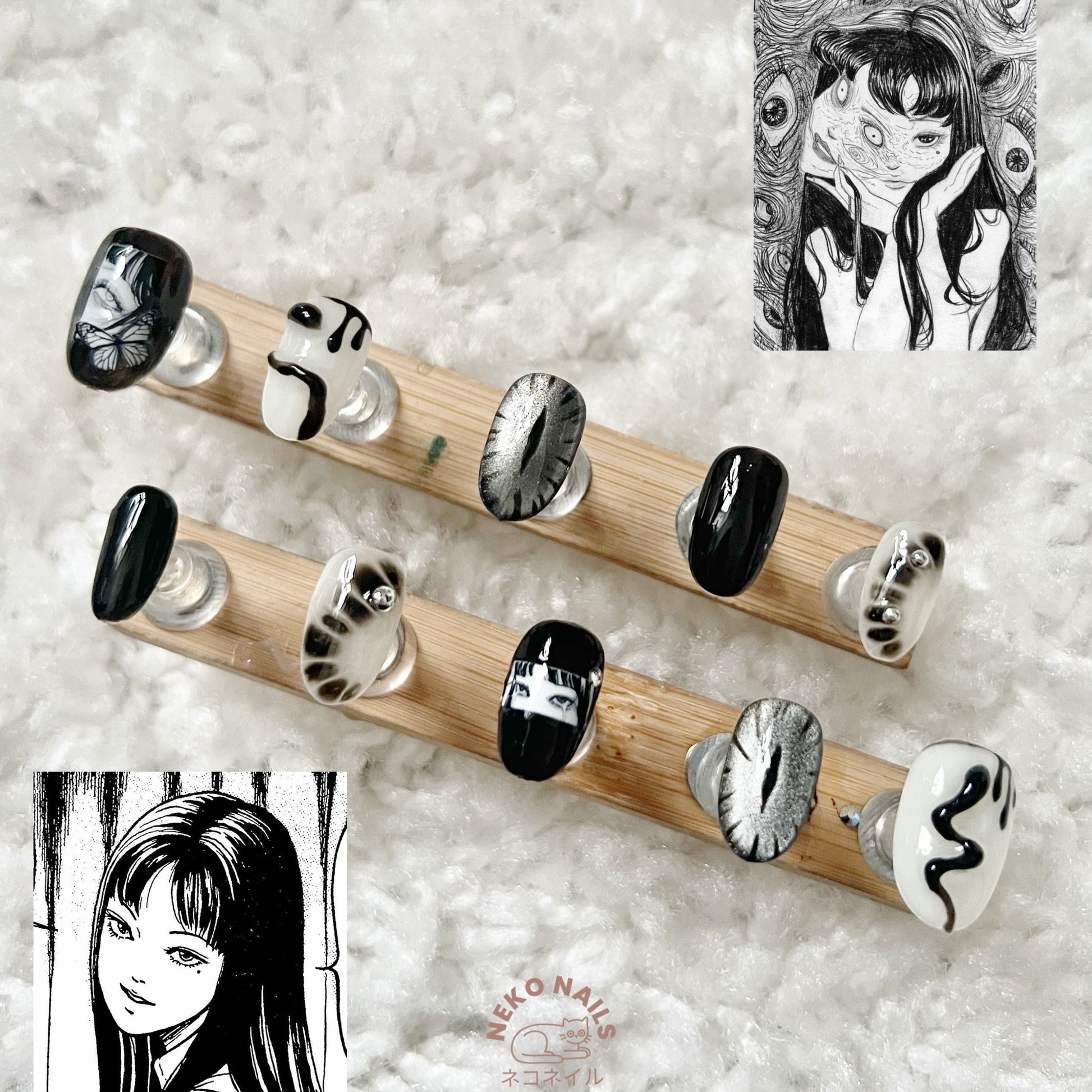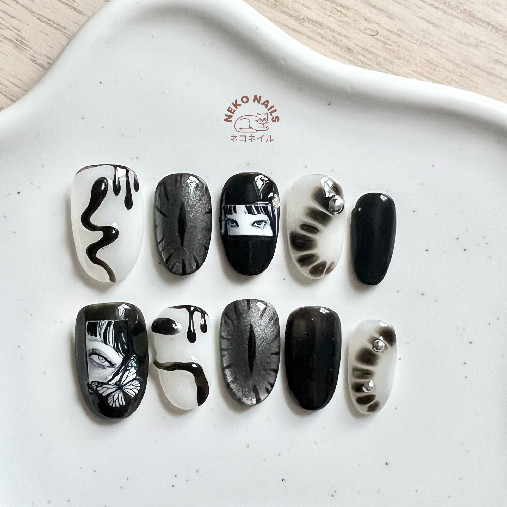 Inspired by the haunting elegance of Junji Ito’s iconic character, this Halloween special captures the eerie beauty of Tomie. Featuring bold monochrome contrasts, hypnotic eye motifs, and surreal black-and-white designs, each nail tells a chilling story. Dark, mysterious, and alluring, this set is perfect for horror lovers who want to embrace a gothic edge with high-fashion detail. A statement of both fear and fascination—wear Tomie and let the nightmare live on.